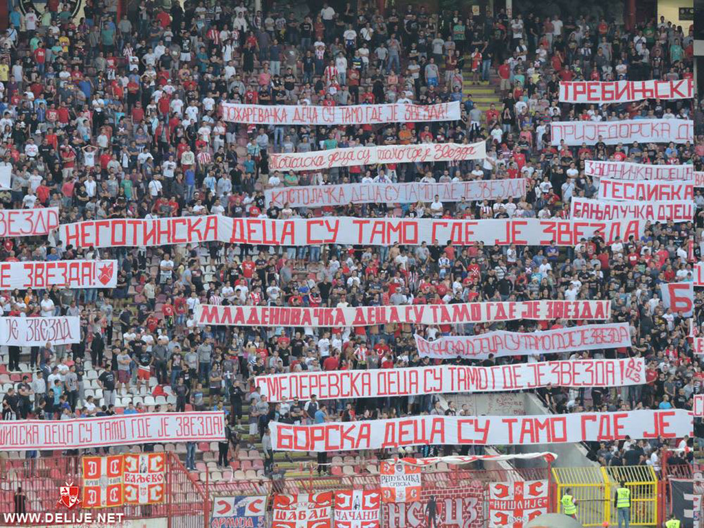 Navijači Zvezde koji dolaze iz gradova širom Srbije, udruženo su istakli transparente koji se odnose na gradove iz kojih dolaze.