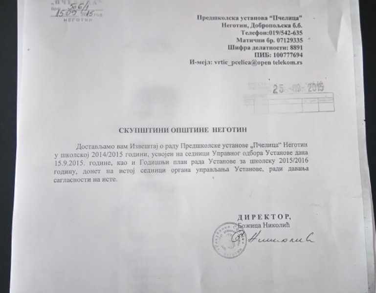 Za kraj napominjem, PU "Pčelica" je ustanova potpuno apolitična i ima sopstvenu autonomiju što znači da je samostalna u donošenju sopstvenih odluka, a lokalna samouprava je zastupljena u Upravnom odboru i to u delu upravljanja ne i rukovođenja ovom Ustanovom. S obzirom na to da je predsednik opštine Negotin, gospodin Milovanović na sednici SO Negotin rekao da opštini nije dostavljen i Program rada PU "Pčelica" javno prilažem zaveden dokument koji je stigao na adresu opštine kao dokaz i potvrdu svega onog što sam rekla. " - saopštila je direktorka PU "Pčelica", Božica Nikolić.