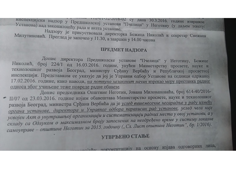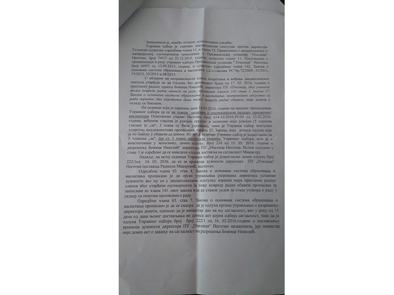 Zbog već više puta iznesenih neistina predsednika opštine Negotin na račun naše ustanove, obratila sam se i zaštitniku građana Saši Jankoviću jer se iz ovakvog ponašanja Milovanovića jasno vidi želja da se ukaže na nepostojeće probleme u funkcionisanju PU „Pčelica“. Ističem i to da PU „Pčelica“ je i pored ovakvih događaja i višemesečnih pokušaja moje smene, funkcionisala besprekorno što se može videti i iz priloženog kao i kroz realizovan plan rada za ovaj period. „ – za ES portal i negotinsku javnost kaže Božica Nikolić, direktor PU „Pčelica“.