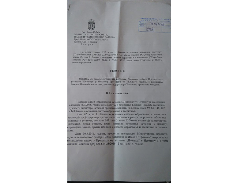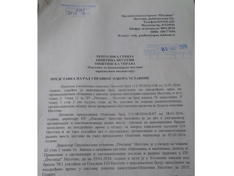 Ne vidim razlog da se predsednik opštine Negotin obraća ministru prosvete Verbiću i to predstavkom kojom se ukazuje na odnosu tj. saradnju ustanove i direktora, kada skupština ima zakonsko pravo da razrešava i imenuje UO ove ustanove.