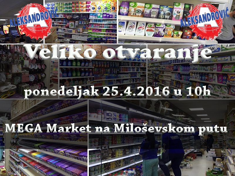 Mega market Aleksandrović nalazi se na Miloševskom putu i najveći je prodajni objekat firme Aleksandrović DOO. Ovaj objekat prostire se na 350 kvadratnih metara i biće opremljen mnogobrojnim artiklima koji će biti na prodaju po akcijskim cenama što je karakteristično za firmu Aleksandrović DOO već godinama unazad.