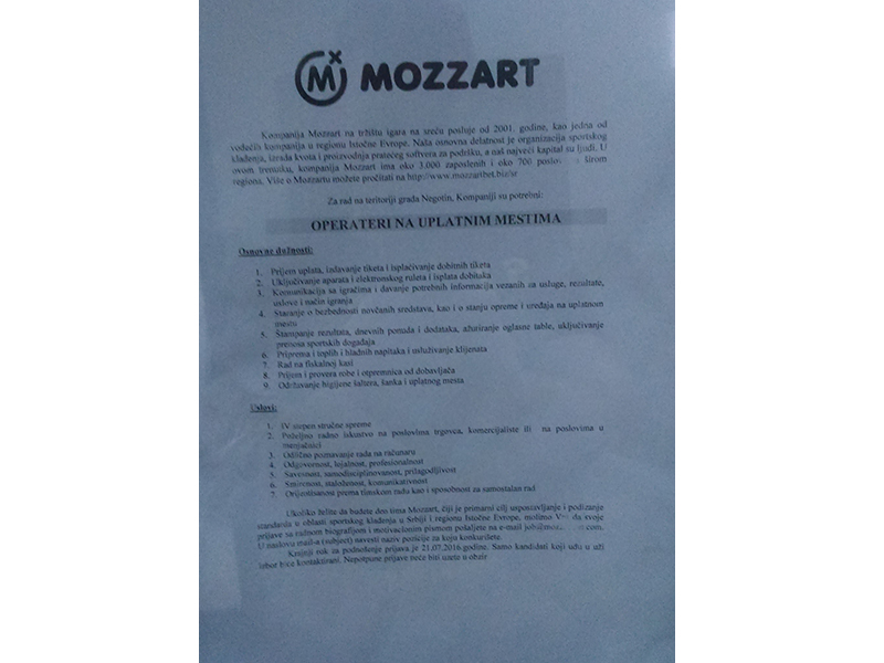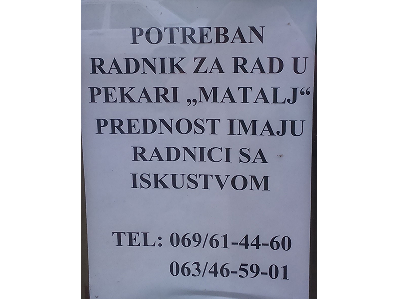 Ono što je iznenađujuće tokom ovog leta, jeste veliki broj oglasa za posao širom grada. Prema do danas viđenom uglavnom je velika potražnja za fizičkom radnom snagom, od molera preko keramičara, zatim frizera, konobara, vozača ali i administrativnog radnika. Neki oglasi već dva meseca blede na izlozima firmi, a postavlja se pitanje da li su Negotinci aktivni i javljaju se na oglase za posao, odnosno da li se poslodavcu javljaju odgovarajući profil ljudi?