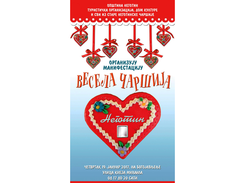 Autor Jovanka StanojevićManifestaciju „Vesela čaršija“ i ove godine u Knez Mihailovoj ulici organizuju Dom kulture „Stevan Mokranjac“ i Turistička organizacija, pod pokroviteljstvom Opštine Negotin. Bogat i sadržajan muzičko zabavni-program počinje u 17 i traće do 20 sati. Zbog održavanja šeste po redu „Vesele čaršije“, Knez Mihailova ulica sutra, 19. januara, od 12 do 21 sat, biće zatvorena za saobraćaj
