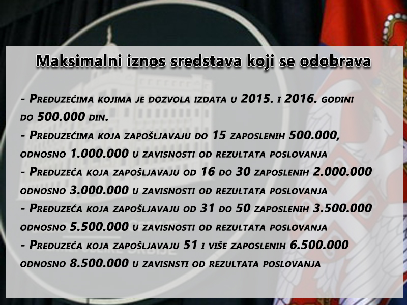 Ukoliko je ukupna vrednost kupljenog i plaćenog repromaterijala u posmatranom periodu veća od 140 miliona dinara za sva preduzeća, kako navode u ovom javnom pozivu, maksimalan iznos sredstava koji se može odobriti preduzeću po skali, umanjuje se procentualno, shodno raspoloživim sredstvima. Prijava sa kompletnom dokumentacijom podnosi se Ministarstvu za rad, zapošljavanje, boračka i socijalna pitanja, Sektoru za zapošljavanje, do 11.februara.