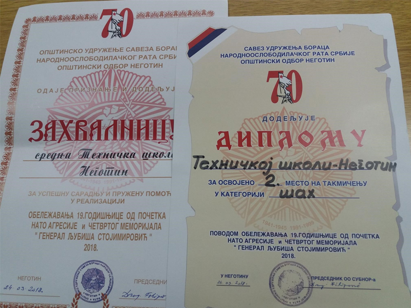 Takođe, ovo isto udruženje je Tehničkoj školi dodelilo i diplomu za osvojeno 2. mesto na takmičenju iz šaha, a koje je bilo obeleženo na isti dan obeležavanja 19. godišnjice bombardovanja Srbije.