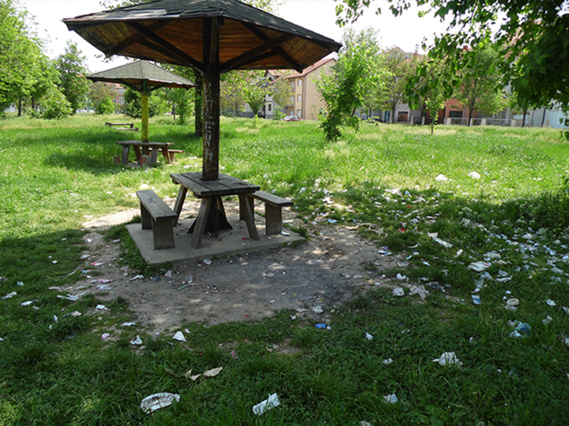 Polomljene klupe, uništeni rekviziti za igru dece, iščupana stabla, mnoštvo pet ambalaže, uglavnom alkoholnog pića, opušci, staklići, paklice cigarete su svakodnevna slika.