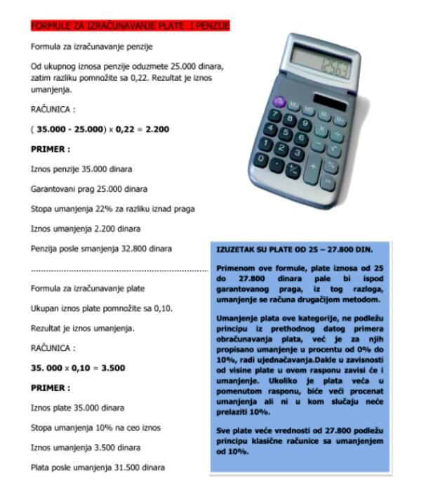Vratimo se na smanjenje plata u javnom sektoru, koje su prilikom saopštenja Vlade Srbije bile podigle ogromnu prašinu i pompu. Naime, ono što je svakako bilo jasno da ovo umanjenje plata neće važiti za radnike u javnom sektoru čija ukupna plata iznosi do 25.000 dinara. Ali problem je nastao prilikom objave načina umanjenja za one radnike u javnom sektoru čija su primanja veća od 25.000 dinara a manja od 28.000 dinara. Radi lakšeg shvatanja i objašnjenja ove, posve konfuzne računice, redakcija East Side-a potrudila se da Vam kroz formularni prikaz to donekle približi i učini jasnijim, ako je to uopšte moguće.