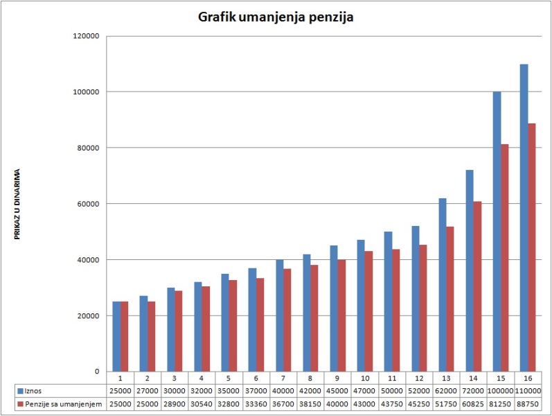 Prema poslednjim istraživanjima na teritoriji Republike Srbije ima 1.399.055 penzionera od kojih je čak 58,3% penzionera sa penzijama do 25.000 dinara i oni ne podležu odluci o umanjenju penzija. Primanja penzionera između 25.000 i 40.000 dinara umanjena je za 22%, dok je onima koji primaju penziju preko 40.000 dinara, ista umanjena za 25% za razliku iznad praga. Treba napomenuti da oni penzioneri čije su penzije veće od 100.000 dinara, umanjene su linearno sa više od 25% ali manje od 30%, opet u zavisnosti od visine primanja. Praktično, nešto više od 41% penzionera ima umanjenje penzija od 22% - 25% za razliku iznad praga.