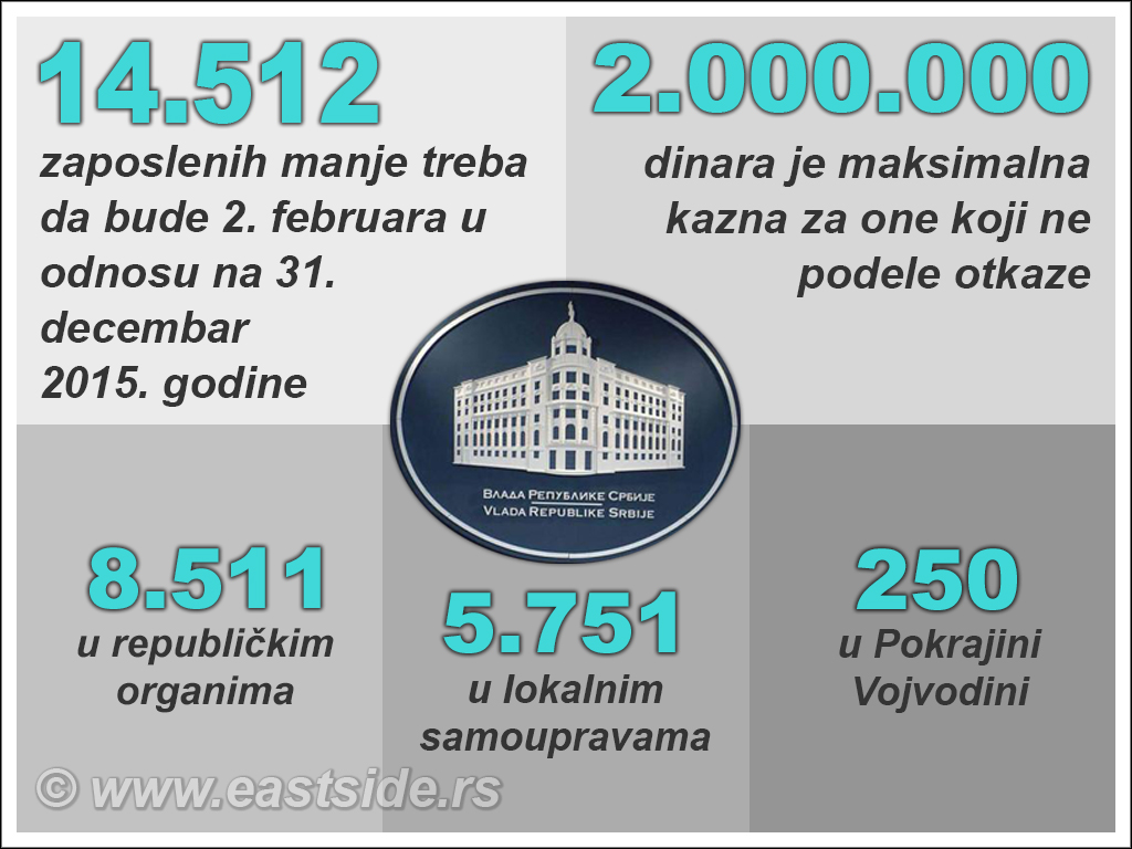 Autor Jelena PerićVlada je u decembru 2015. godine donela odluku da do 2. februara broj zaposlenih u javnoj upravi, treba da bude manji za 14.512 u odnosu na 31. decembar 2014. Svaka treća opština, u kojoj je ustanovljen višak radnika, je već smanjila broj zaposlenih u skladu sa ovom odlukom.
