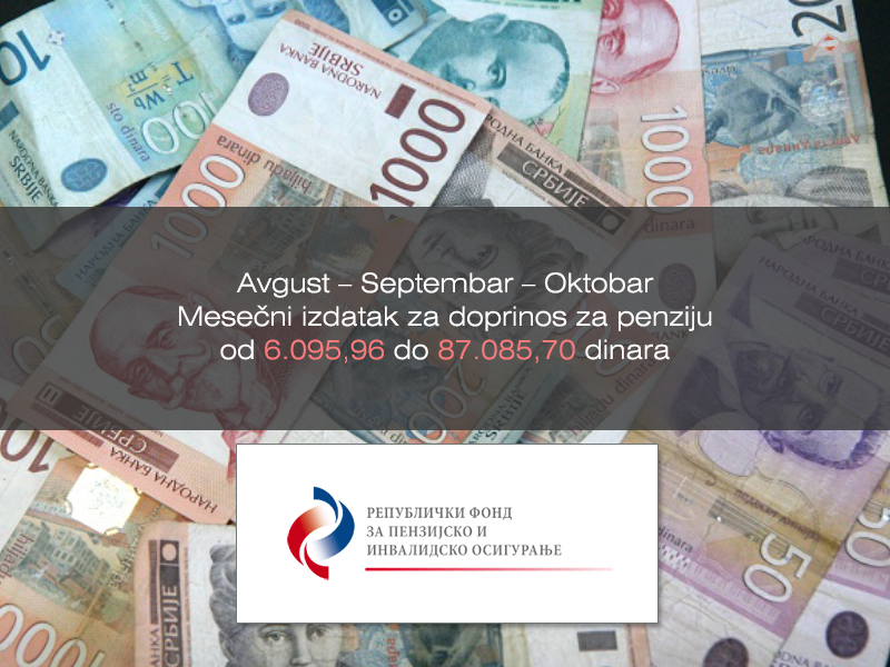 Doprinos za penzijsko i invalidsko osiguranje je 26 odsto, što znači da će se mesečni izdatak kretati u rasponu od 6.095,96 do 87.085,70 dinara. Ovi iznosi primenjivaće se za uplate doprinosa za avgust, septembar i oktobar 2017. godine.