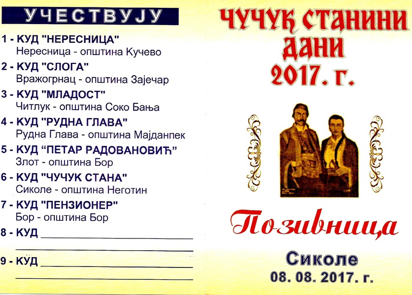 Tako će na 17. po redu “Čučuk Staninim danima”, pored domaćeg ansambla koji nosi Stanino ime, nastupiti članovi kulturno-umetničkih društava “Neresnica” iz Neresnice kod Kučeva, “Sloga” iz Vražogrnca kod Zaječara, “Mladost” iz Čitluka kod Sokobanje, “Rudna glava” iz istoimenog sela u opštini Majdanpek, kao i borski folklorni ansambli “Penzioner” i “Petar Radovanović” iz Zlota.