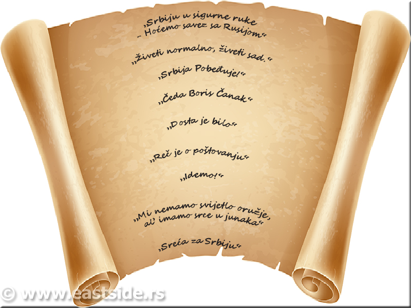 Da ima samoljubljivijih i od naprednjaka pokazali su bivši predsednik Tadić i njegovi koalicioni partneri, koji su zaključili da im slogan uopšte nije potreban kad će njihova zvučna imena sama po sebi privući glasače. Tako je rođen „Čeda Boris Čanak“.