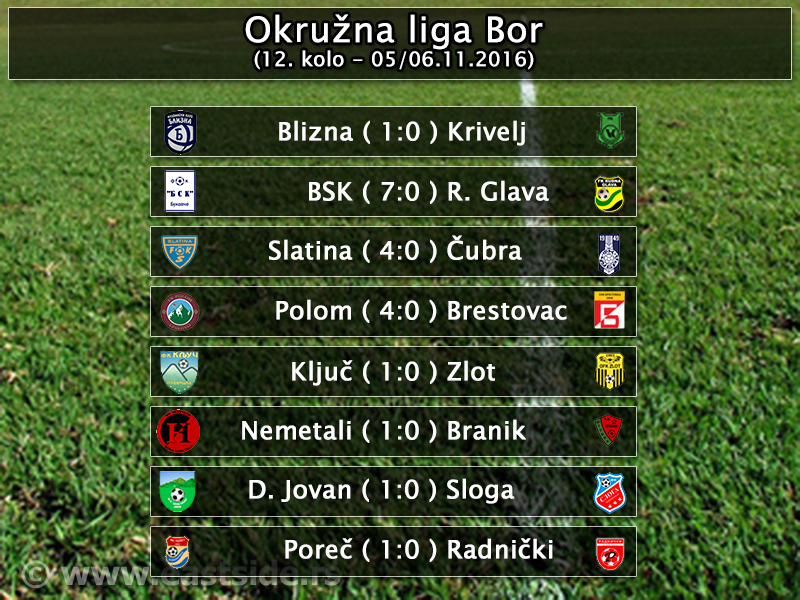 Od pet ekipa iz Opštine Negotin koje se takmiče u Okružnoj ligi Bor samo dve su osvojile bodove u 12. kolu. Fudbaleri BSK Bukovča na svom terenu ubedljivo su savladali ekipu Rudne Glave rezultatom 7:0, dok je Deli Jovan u Sikolu slavio protiv Sloge iz Kobišnice minimalnim rezultatom 1:0. Čubra je poražena na “vrućem” terenu u Borskoj Slatini sa 4:0, dok je Branik pretrpeo poraz od Nemetala sa 1:0.
