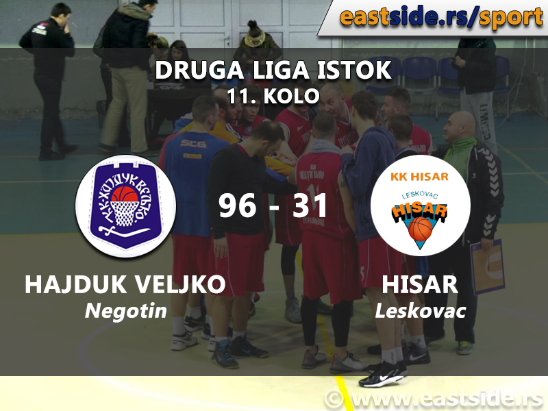 Autor Bojan ŽivanovićKošarkaši Hajduk Veljka u 11. kolu Druge lige Istok pobedili ekipu Hisara iz Leskovca rezultatom 96:31. Ovom pobedom negotinski košarkaši preuzeli vođstvo na tabeli. U narednom kolu gostuju u Boru gde se sastaju sa ekipom Zicera.