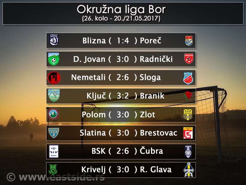 Autor Bojan ŽivanovićOd osam utakmica 26. kola Okružne lige Bor četiri su registrovane službenim rezultatom. Pobede Sloge, Deli Jovana i Čubre, porazi Branika i BSK Bukovča.