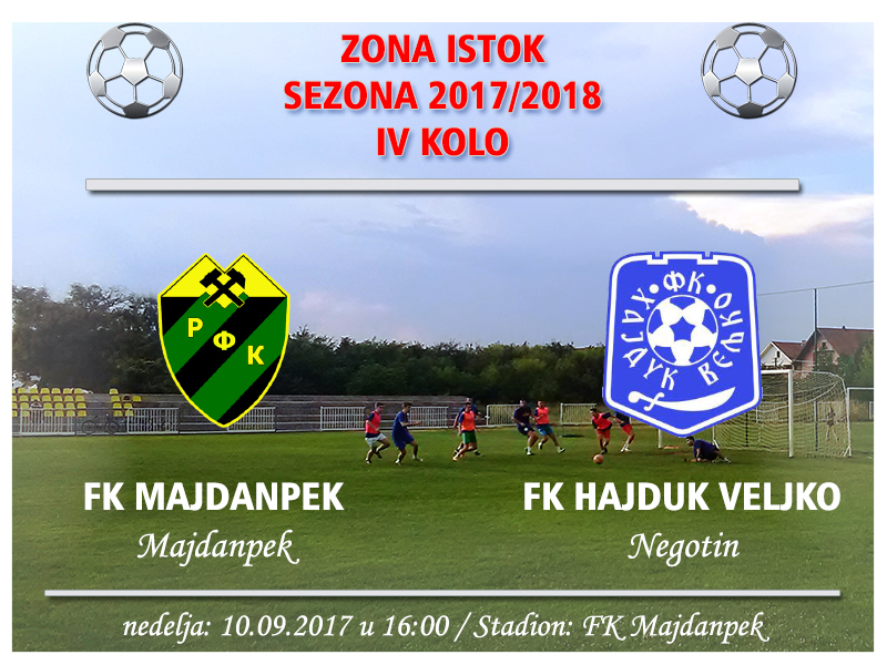 Autor Bojan ŽivanovićFudbaleri Hajduk Veljka, u četvrtom kolu Zone Istok gostovaće u Majdanpeku. Negotinski zonaš sa 4 boda zauzima deseto mesto na tabeli, dok je Majdanpek sa bodom manje na trinaestom. Utakmica se igra u nedelju od 16 sati.