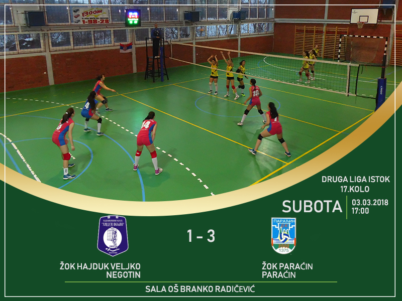 Autor Bojan ŽivanovićOdbojkašice Hajduk Veljka poražene su u 17. kolu Druge lige Istok od ekipe Paraćina rezultatom 1:3, dok su negotinski odbojkaši sa maksimalnih 3:0 poraženi od Ozrena u Sokobanji. Negotinske odbojkašice sa 19 bodova ostale su na osmom mestu, a odbojkaši na pretposlednjem sa samo 6 bodova.