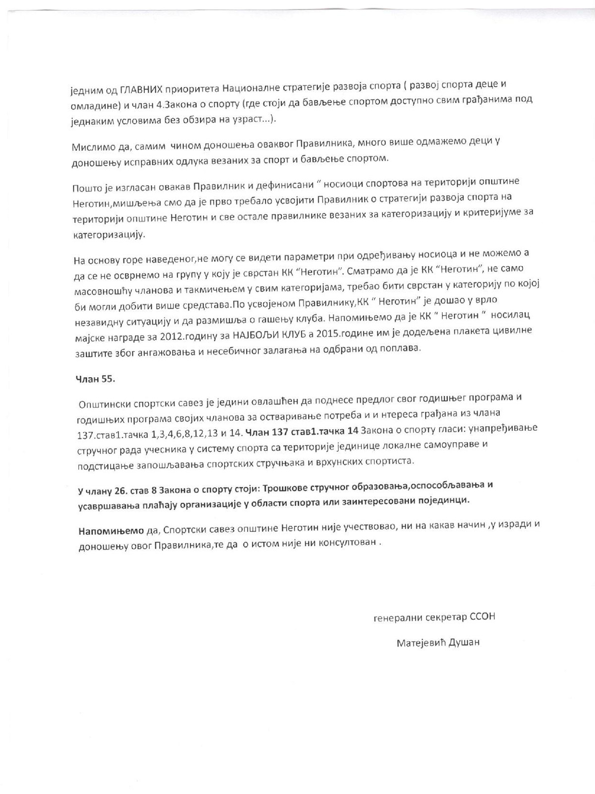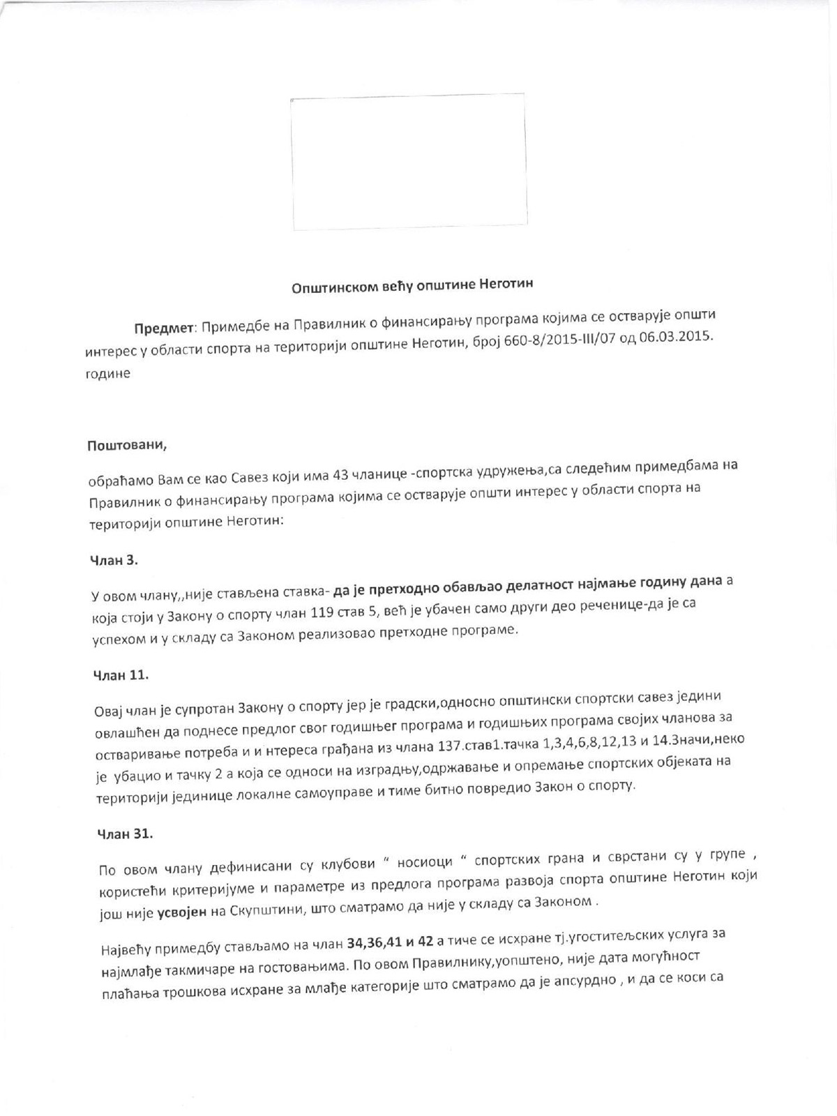 Prenosimo u celosti pismo, odnosno Primedbu SSON-a Opštinskom veću na Pravilnik o finansiranju programa kojima se ostvaruje opšti interes u oblasti sporta na teritoriji opštine Negotin.