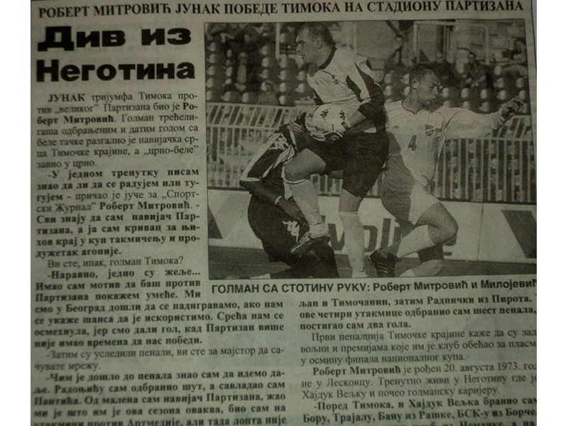 „Timok je bio na ivici egzistencije. Bez struje, bez vode i u finansijski nezamislivim uslovima. Ipak, zahvaljujući velikim srcem i nenormalnom borbenošću beležimo odlične rezultate. Uspevamo da eliminišemo ekipu Partizana u Kupu a ja bivam proglašen igračem utakmice. Te sezone sam postigao i gol protiv Partizana i odbranio ukupno 19 od 26 penala sviranih protiv nas. Sezona za pamćenje.“ – sa setom za ES portal govori Mitrović.
