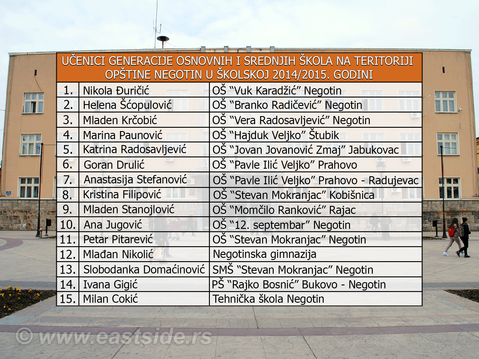Petnaest najboljih učenika osnovnih i srednjih škola na teritoriji opštine Negotin dobilo je novčane nagrade od 30.000 dinara. Osim predsednika opštine Negotin, Jovana Milovanovića ovom prijemu prisustvovala je i Daniela Pejčić, član opštinskog Veća zadužena za oblast obrazovanja.