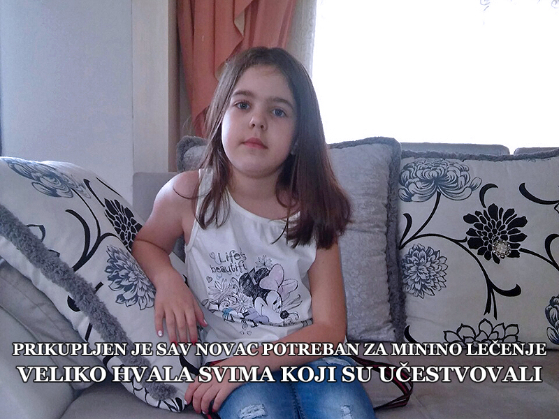 Podsećanja radi, prvom akcijom za prvu seansu lečenja u Turskoj bilo je neophodno prikupiti oko 18.000 evra. Uspeli smo u tome! Mina je dobro podnela primarni medicinski tretman. Zatim, bilo je potrebno prikupiti nešto više od 54.000 evra. Ljudi širom Srbije uspešno su rešili i ovaj zadatak iz humanosti. Sada predstoji velika borba za našu malenu sugrađanku Minu, i sigurni smo da će je ona uspešno prebroditi.