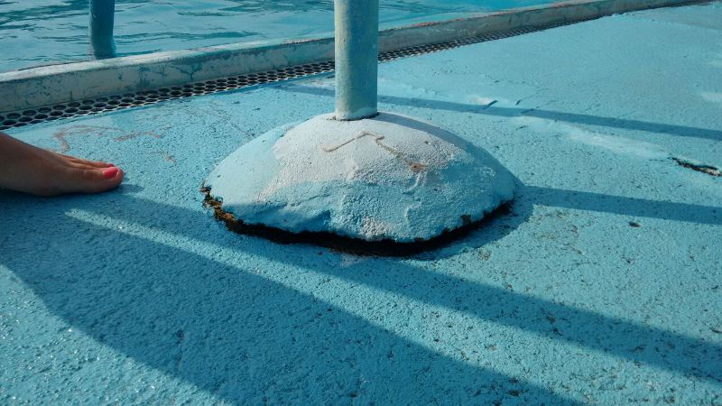 Naime, reč je o penjalici na domak bazena koja je u veoma lošem stanju i koja je polomljena i nestabilna. Deo na kojem je fiksirana penjalica je napuko pa samim tim ona je veoma nestabilna i klimava. Pritom, ne postoji obaveštenje odnosno upozorenje da je ona trenutno disfunkcionalna i da je moguće doći do povreda onih koji se usude da pomoću nje izađu ili uđu u bazen.