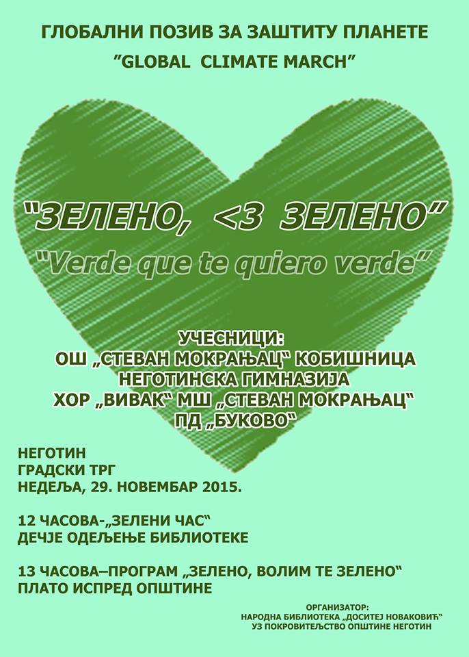 Na inicijativu Lidije Vuković Tomović, profesorke engleskog jezika i aktivistkinje globalnog pokreta „AVAAZ“, a pod pokroviteljstvom Opštine Negotin i u organizaciji Narodne biblioteke „Dositej Novaković“, naš grad će u nedelju biti deo sveta i globalne poruke. Kako Tatjana Panić, član opštinskog veća za kulturu i turizam navodi, cilj akcije je da se pošalje poruka o važnosti smanjenja emisije štetnih gasova koji izazivaju efekat staklene bašte, ali i edukacija đaka učesnika i ostalih prisutnih.