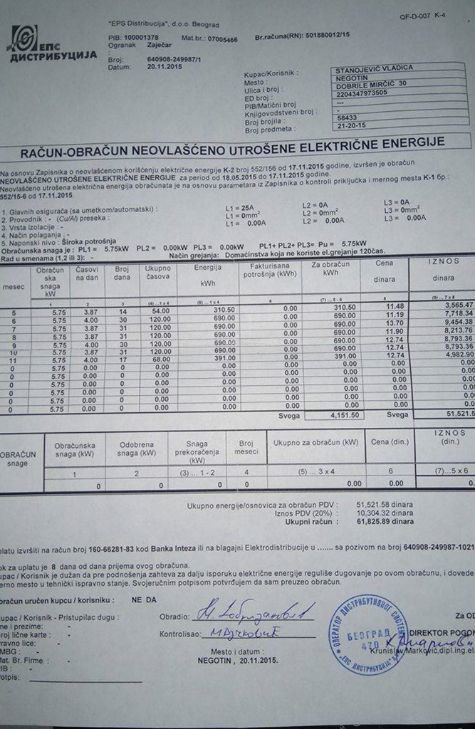 „Šta je zapravo pravda?! Da li je uopšte ima kod nas? Najpre primetim da mi pristižu visoki računi za potrošnju električne energije, a da pritom i ne boravim u kući, a onda u nadi da će mi neko od nadležnih objasniti o čemu je reč, za uzvrat dobijem kaznu za neovlašćenu potrošnju električne energije u iznosu oko 60.000 dinara i plus 81.000 dinara za mesečni račun! Zaista ne znam o čemu je reč?! Pa ljudi, suludo je da li bih sama sebe prijavila da sam „krala“ struju!?!“ – počinje priču za ES portal vidno uznemirana Vladica Stanojević.