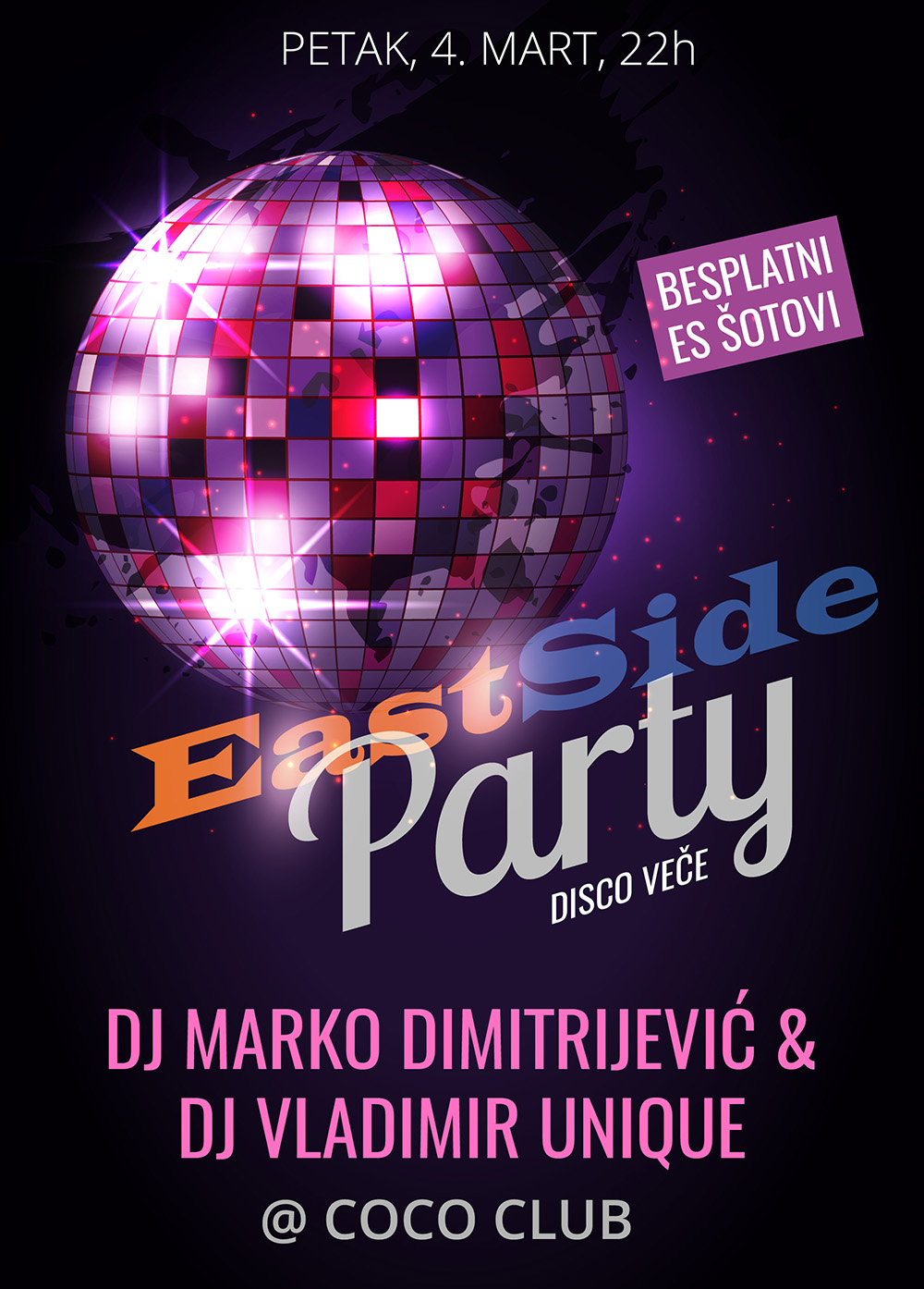 BUDITE DEO PRVE EAST SIDE ŽURKE U COCO CLUBU! DOĐITE DA SE U DOBROJ ATMOSFERI UZ KVALITETNE ZVUKE UPOZNAMO I DOBRO PROVEDEMO. VAŠ EAST SIDE PORTAL!