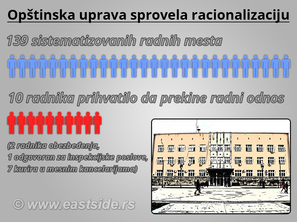 Autor Jelena PerićNakon donošenja Zakona o maksimalnom broju zaposlenih u javnom sektoru, lokalne samouprave su počele da sprovode racionalizaciju. Kako ES portal od Nadežde Todorović, načelnika Opštinske uprave saznaje, Opštinska uprava je sprovela racionalizaciju, a 10 radnika je prihvatilo da sporazumno prekine radni odnos.