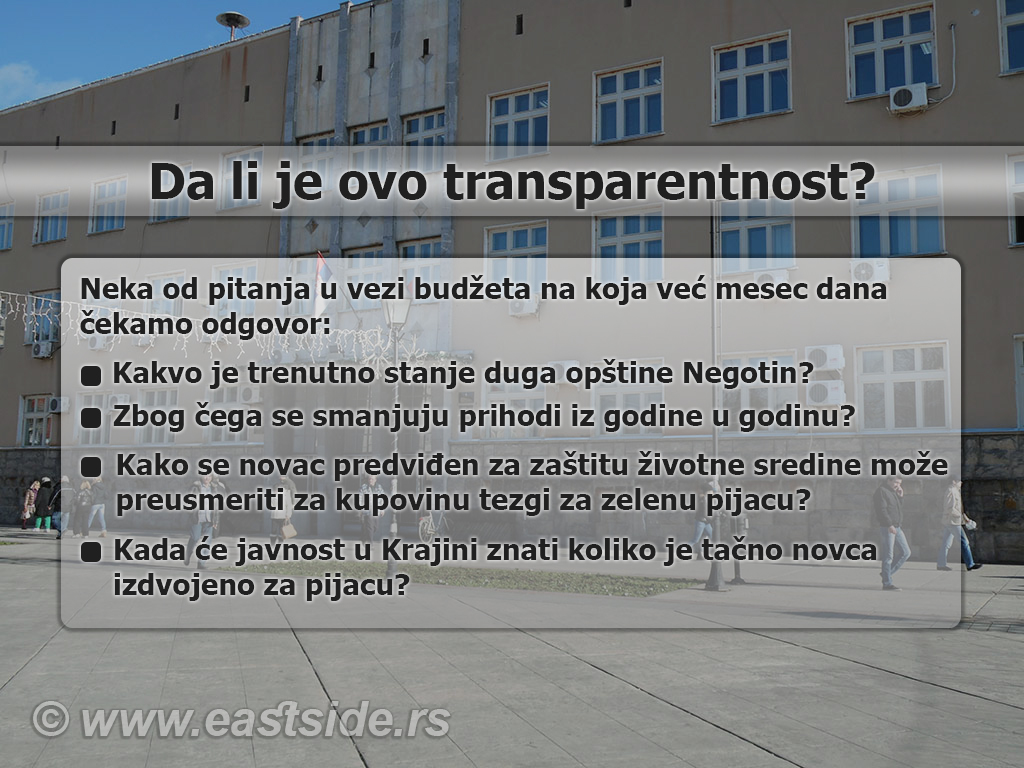 Prošlo je skoro mesec dana, a odgovor na pitanja od kojih su neka: Kakvo je trenutno stanje duga opštine Negotin?; Zbog čega se smanjuju prihodi iz godine u godinu?; Kako se novac predviđen za zaštitu životne sredine može preusmeriti za kupovinu tezgi za zelenu pijacu? Kada će javnost u Krajini znati koliko je tačno novca izdvojeno za pijacu?; nismo dobili. Iz opštine nas uveravaju da moramo biti strpljivi, da su u Odeljenju za budžet, finansije i lokalnu poresku administraciju zatrpani poslom, da nisu sva postavljena pitanja nadležnost ovog Odeljenja, ali da ćemo odgovore sigurno dobiti.