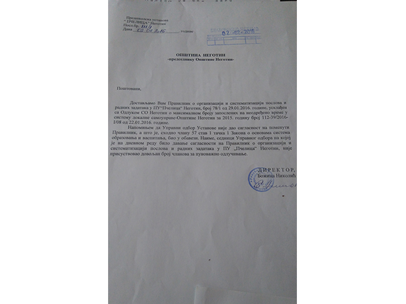„Ustanova se više puta obraćala predsedniku opštine Negotin Jovanu Milovanoviću, i tom prilikom smo ga obaveštavali na nezakonit rad UO kao i na donošenje Odluka koje su po zakonu dužni i da donesu. Ukazivali smo i na probleme zbog kojih ova ustanova ima, a posledica su konstantnog pritiska na mene, tačnije želju da mi se uruči otkaz u nadi da ćemo na Skupštini staviti predlog za promenu UO koji nastavlja sa nezakonitim radom.