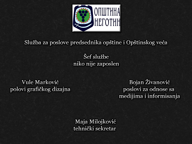 3. Polovi grafičkog dizajna – Neka od zaduženja: obavlja operativne i tehničke poslove u oblasti grafičkog dizajna, odgovoran je za dizajn reklamnog materijala za potrebe predsednika opštine -prospekti, pozivnice, kalendari, sajamski štandovi i drugo, učestvuje u dizajnu elektronskog predstavljanja opštine i predsednika opštine, priprema video materijale, spotove, reklame i slično. Uslovi: IV stepen elektrotehničke, mašinske ili dizajnerske struke, poznavanje rada na računaru, 1 godina radnog iskustva i položen stručni ispit za rad u organima uprave. Na ovom radnom mestu je zaposlen Vule Marković.