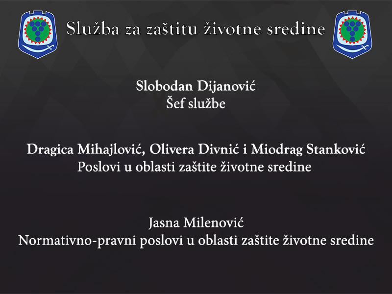 Šef službe – neka od zaduženja: organizuje i rukovodi procesom rada, raspoređuje poslove na neposredne izvršioce, donosi i potpisuje akta iz delokruga rada Službe, obavlja poslove praćenja stanja životne sredine, predlaže mere za unapređenje, očuvanje i zaštitu životne sredine, učestvuje u sprovođenju energetske politike u skladu sa zakonom, itd. Uslovi: visoko obrazovanje stečeno na studijama drugog stepena Fakulteta zaštite na radu, 3 godine radnog iskustva i položen stručni ispit. Na ovom radnom mestu je zaposlen Slobodan Dijanović.