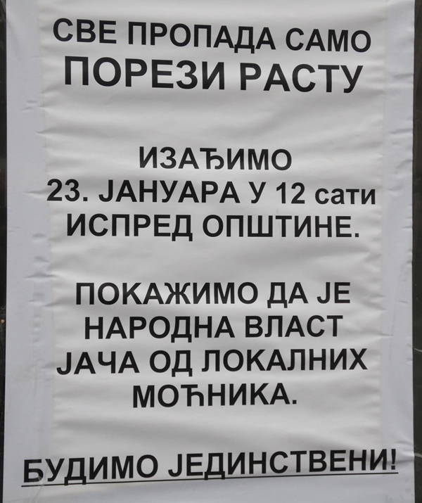 Tačno 12 časova ispred zgrade Opštine Negotin, po hladnom i kišovitom vremenu, započeo je protest meštana Negotinske Krajine nezadovoljnim visokom naplatom poreza na imovinu. Slogan koji je pratio nove proteste u Negotinu glasi " Sve propada samo porezi rastu". Nezadovoljstvo izrazilo je nešto više od stotinu meštana, koji su nakon okupljanja u centru Negotina krenuli u protestnu i mirnu šetnju, ovoga puta bez uvredljivih povika na račun lokalne vlasti. Nakon kratke protestne šetnje, zastali su pored spomenika Đorđa Stanojevića, gde je kratak govor održao Dragoslav Cvetković, doskorašnji član Opštinskog veća.