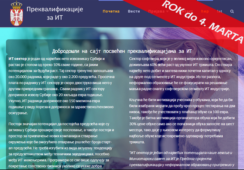 Autor Suzana M. JovanovićMinistarstvo državne uprave i lokalne samouprave u saradnji sa IT zajednicom pokrenulo je pilot projekat prekvalifikacija u sektoru informacionih tehnologija za 100 kandidata. Prijavljivanje traje do subote, 4. marta u 23:59 sati putem sajta www.itobuke.rs.