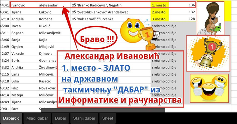 Aleksandar Ivanović, učenik petog razreda OŠ “Branko Radičević” osvojio je zlato sa ukupno 136 poena na republičkom informacionom takmičenju “Dabar”, u kategoriji “Dabarčić”. Veljku Perišiću, učeniku sedmog razreda u kategoriji “Mladi dabar” pripalo je srebro sa 103 poena. Učenici sedmog razreda Miloš Tomić i Iva Balčanović su, u istoj kategoriji, osvojili bronzu, kao i Aleksa Paunović, učenik petog razreda u kategoriji “Dabarčić”.