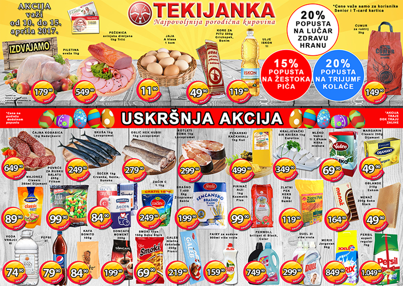 Kako bi Uskršna trpeza bila što bogatija a povoljnija, veliki broj artikala se nalazi na dodatnom sniženju. Tekijanka poručuje kupcima da u maloprodajnim objektima prilikom kupovine obrate pažnju na artikle čija je cena odštampana na žutom papiru. Veliki broj proizvoda za spremanje Uskršnje trpeze i kolača, proizvodi iz kategorije pića, sveže voće i povrće su ovih dana pravi izbor u kupovini. Pored ovih sjajnih proizvoda koji su potrebni svakom domaćinstvu, procentualno su sniženi i proizvdi sledećih robnih grupa: 15% popusta korisnici Tcard kartica imaju na žestokim pićima, 20% popusta na Lučar zdravoj hrani i 20% popusta na Trijumf kolačima. Ovakvim akcijma Tekijanka zasigurno opravdava slogan “Najpovoljnija porodična kupovina”.