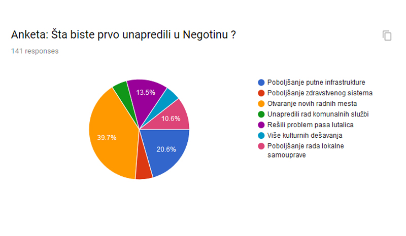 Najviše građana je glasalo upravo za otvaranje novih radnih mesta i to 39,7%, sledeća stvar koju bi menjali je poboljšanje putne infrastrukture njih 20,6%.
