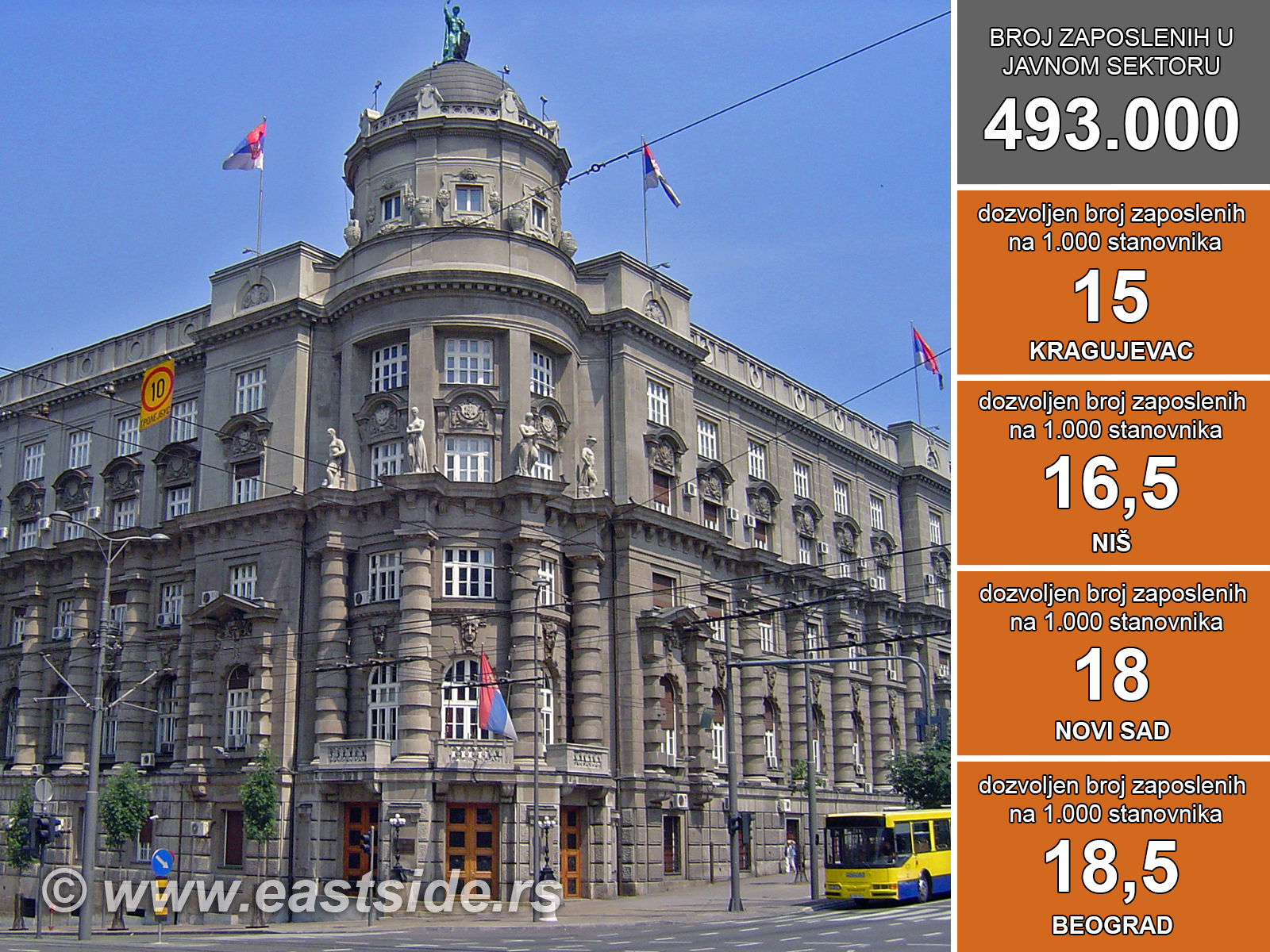 Pravila za lokalne samouprave su utvrđena, pa one već sada mogu da izračunaju koliko službenika smeju imati na platnom spisku, iako kao otvoreno i dalje ostaje pitanje selekcije. Za opštine u kojima živi do 50 000 stanovnika dozvoljeno je 9,50 zaposlenih na 1 000 ljudi. Mesta koja imaju 100 000 žitelja mogu da zaposle 11 činovnika na 1 000 stanovnika. Primera radi, Kragujevac je dobio kvotu od 15, Niš 16,5, Novi Sad 18, a Beograd 18,5 službenika na 1 000 ljudi.