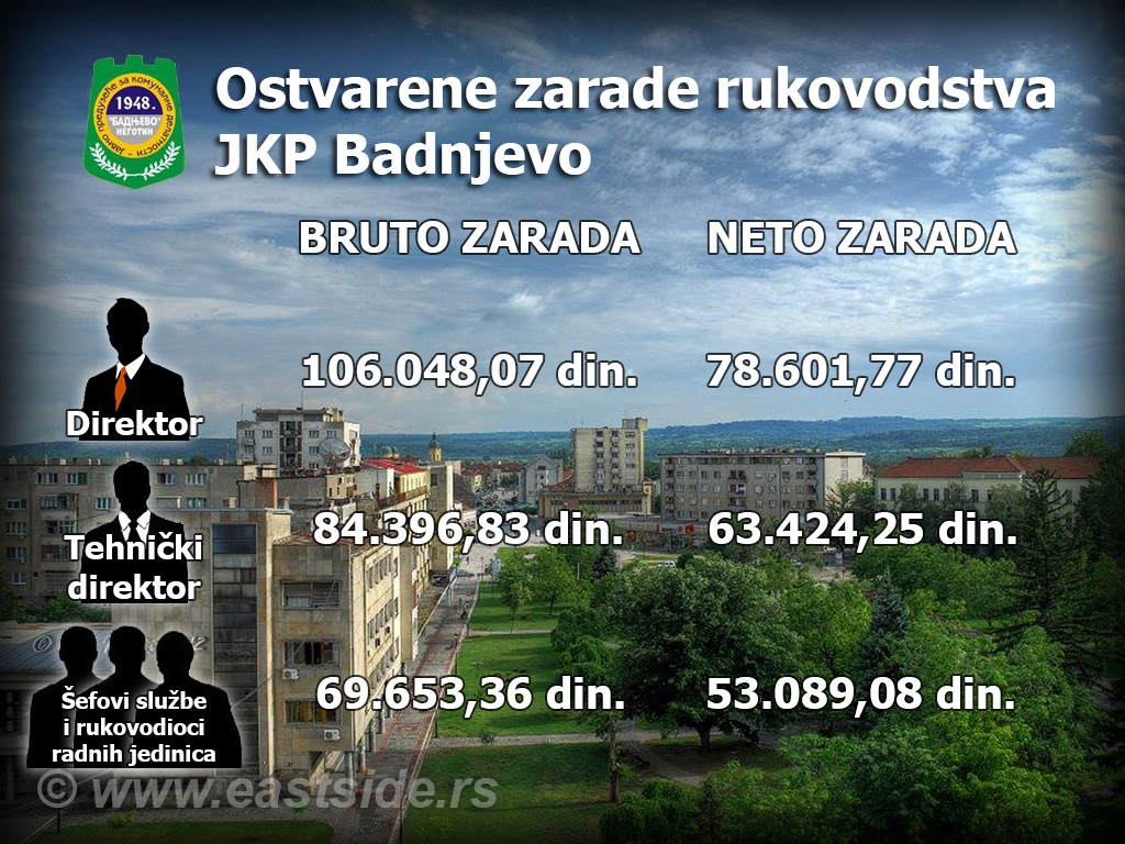 Tragom informacija koje su od javnog interesa i značaja, ekipa ES portala negotinskoj javnosti prikazuje neto i bruto zaradu zaposlenih na višim funkcijama u JKP "Badnjevo". Razumljivo najveću mesečnu zaradu u ovom preduzeću ima i najodgovorniji v.d. direktor čija neto zarada iznosi ni manje-ni više nego 78.601,77 dinara, a ukupna bruto zarada 106.048,07 dinara! Za oko 15.000 dinara manje zaradi tehnički direktor ili tačno rečeno 63.424,25 dinara neto zarade. Na trećem mestu u ovoj firmi po primanjima nalaze se šefovi službe i rukovodioci radnih jedinica koji imaju prosečnu neto zaradu 53.089,08 dinara.