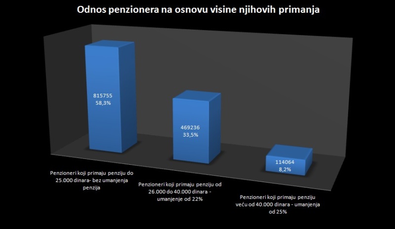Prema poslednjim istraživanjima na teritoriji Republike Srbije ima 1.399.055 penzionera od kojih je čak 58,3% penzionera sa penzijama do 25.000 dinara i oni ne podležu odluci o umanjenju penzija. Primanja penzionera između 25.000 i 40.000 dinara umanjena je za 22%, dok je onima koji primaju penziju preko 40.000 dinara, ista umanjena za 25% za razliku iznad praga. Treba napomenuti da oni penzioneri čije su penzije veće od 100.000 dinara, umanjene su linearno sa više od 25% ali manje od 30%, opet u zavisnosti od visine primanja. Praktično, nešto više od 41% penzionera ima umanjenje penzija od 22% - 25% za razliku iznad praga.