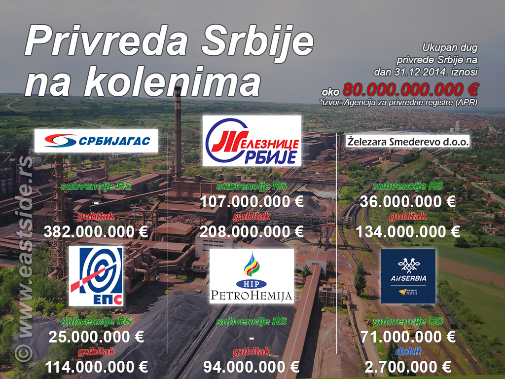Neto gubitak privrede Srbije u 2014. godini iznosi 132 milijarde dinara. Ako Vas ovaj iznos nije preterano zaprepastio, onda će vas cifra od 3.300 milijardi dinara, koliko iznosi sveukupan gubitak, koji uključuje i one nagomilane tokom predhodnih godina, sigurno ostaviti bez teksta. Ipak, najšokantnija je činjenica da ukupan dug srpske privrede iznosi oko 80 000 000 000 evra.