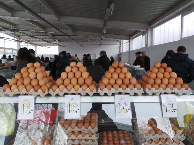Na tezgama na zelenoj pijaci proizvođači jaja prodaju uzgred uz druge poljoprivredne proizvode, sezonsko voće i povrće. Kod njih je cena od 9 do 15 dinara, a količina u ponudi je i, inače, skromnija od kada radi nova pijaca sa mlečnom halom. Oni ističu da iznose domaća, sveža jaja i da se kokoške nosilje zdravo hrane, valjda u nameri da ubede kupce da je njihova korpa pravo mesto iz koga treba preuzeti i kupiti jaja bez kojih je trpeza nezamisliva.