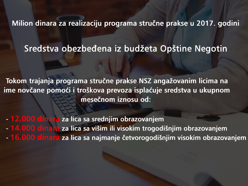 Istoga dana kada i Javni poziv za dodelu subvencija za samozapošljavanje u 2017. godini, dakle 19. juna, Nacionalna služba za zapošljavanje i Opština Negotin, raspisali su i Javni poziv za realizaciju programa stručne prakse u 2017. godini, koji će biti finansiran isključivo sredsvima iz opštinskog budžeta u planiranom izosu od jednog miliona dinara.