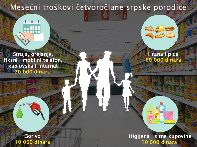 I time se lančano otvaraju nova pitanja i nameću odgovori bez uporišta. Mesečni troškovi jedne četvoročlane porodice, ako se sve sabere, uz osnovne troškove za hranu i režijske – stanovanja, realno premašuju 100 000 dinara. Istraživanja i sabiranja potvrđuju da je samo za hranu i piće potrebno oko 60 000 dinara. Za režijske troškove stanovanja - komunalije : struju, grejanje, fiksni i mobilni telefon, kablovsku i internet, dodatnih oko 20 000 dinara. Ukoliko se redovno seda u automobil bez odlaska na duže destinacije, okvirno samo gradska i vožnja do prigradskih naselja, po aktuelnim cenama benzina odneće još desetak hiljada dinara, a sitne neplanirane kupovine bez kojih se ne može, higijene na primer, zaokružiće čaroban iznos od te nedostižne stotine hiljada dinara o kojoj maštaju građani Srbije.