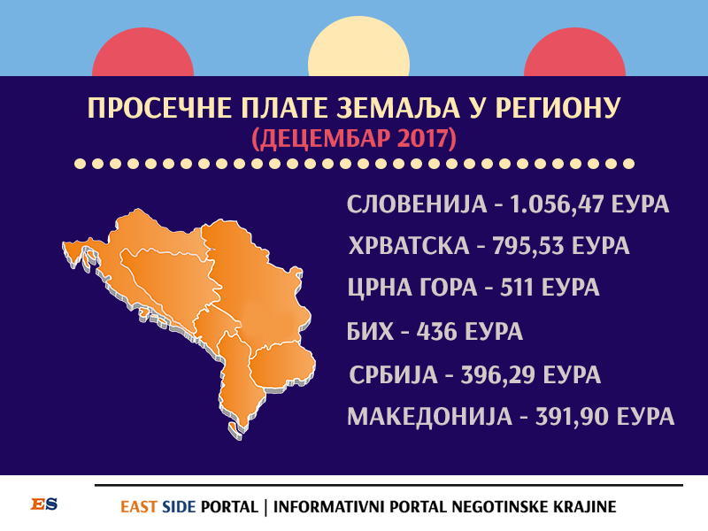 Zanimljiv je i podatak da je u odnosu na kraj 2016. godine u 2017. godini najviše porasla prosečna plata u Hrvatskoj i to za 45,83 evra, a najmanje u Bosni i Hercegovini 8,13 i Crnoj Gori osam evra.