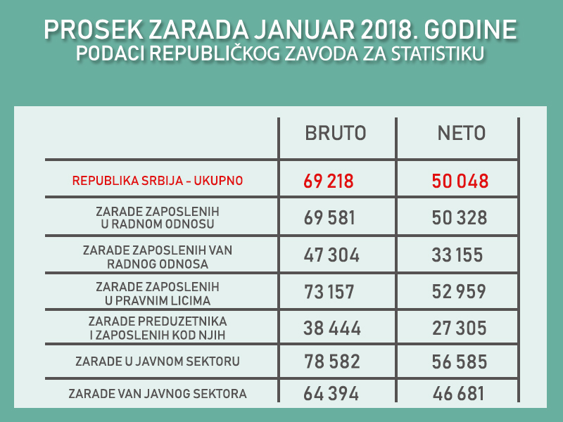 Autor Aleksandar MihajlovićNa sajtu Republičkog zavoda za statistiku objavljeni su podaci o prosečnoj zaradi po zaposlenom za mesec januar 2018. godine. Naime, prosečna bruto zarada za ovaj mesec bila je 69.218 dinara, dok je prosečna zarada bez poreza i doprinosa(neto) iznosila 50.048 dinara.