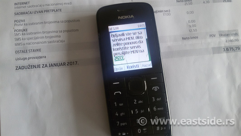“Na računu stoji stavka: usluge provajdera 2.160 din. Proveravala sam šta bi to moglo da bude i tu vidim stoji broj MOV servisa. Probala sam da otkrijem odakle je, ali nisam uspela, očigledno da nije domaći servis. Tražila sam od operatera listing dolaznih poziva i poruka, ali su mi rekli da ne mogu da mi to daju. Na tom listingu bi se videlo sa koga mi broja stižu poruke i koliko ih je bilo. Obratila sam se i njihovim operaterima, ali su mi i oni rekli da mogu da mi daju listing poruka koje sam ja slala”, ogorčena je ova Negotinka.