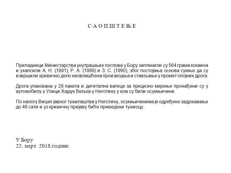 Autor East SideNa vest o hapšenju tri osobe osumljičene da su izvršile krivično delo neovlašćene proivodnje i stavljanja u promet opojnih droga prenosio zvanično saopštenje.